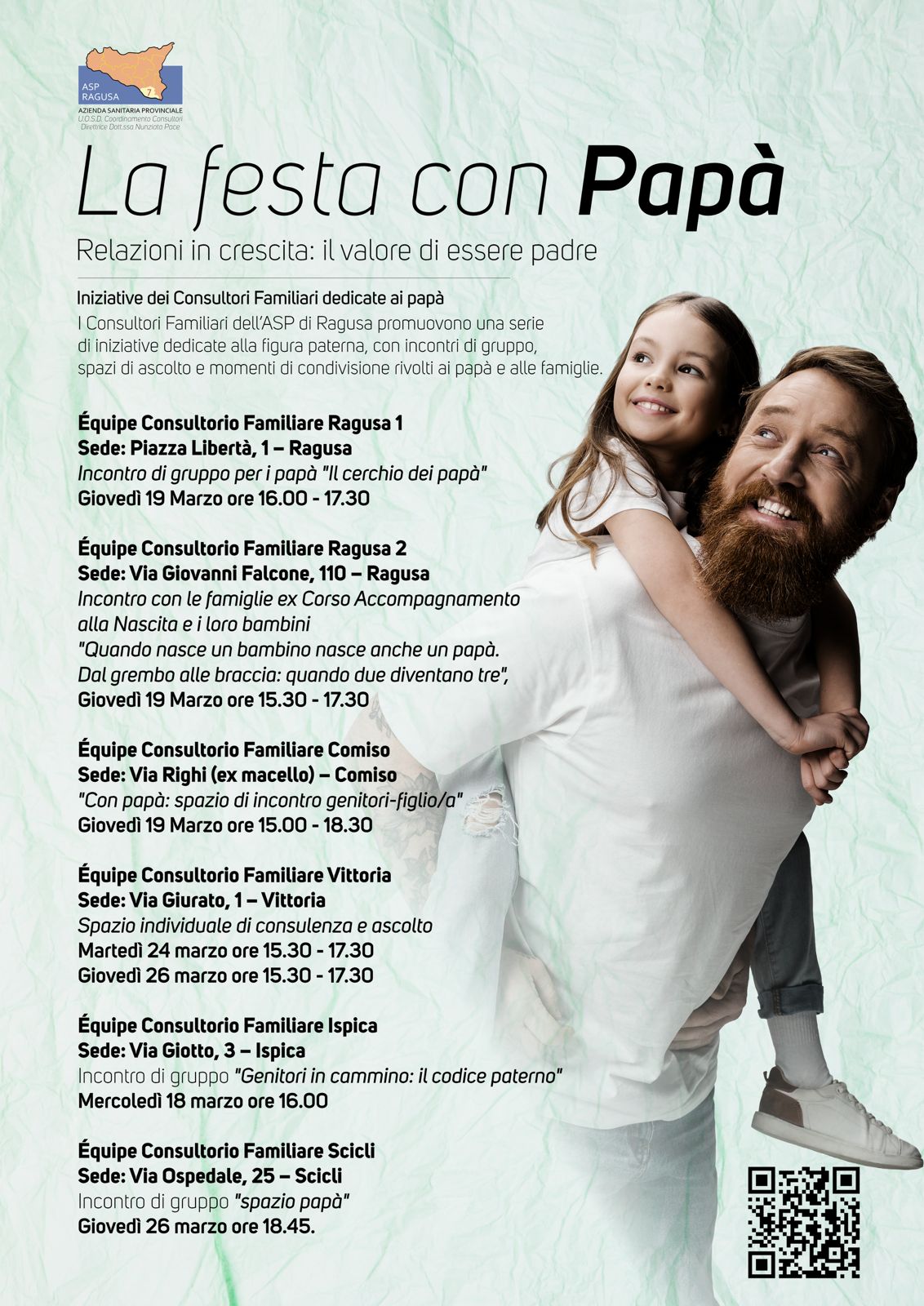 Ragusa, 17 marzo 2026 – In occasione della Festa del Papà, i Consultori familiari dell’ASP di Ragusa promuovono una serie di incontri e momenti di confronto dedicati al ruolo paterno e alla relazione con i figli. Le iniziative, organizzate dall’U.O.S.D. Coordinamento Consultori, diretta dalla dottoressa Nunziata Pace vogliono offrire ai papà e alle famiglie uno spazio di dialogo, condivisione ed ascolto, valorizzando il ruolo della figura paterna nel percorso di crescita dei bambini.