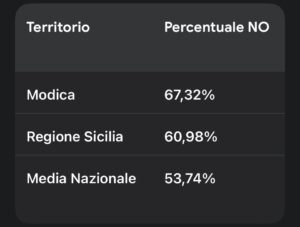 Con questo risultato, Modica si attesta come la realtà con la più alta percentuale di NO dell’intera provincia di Ragusa, confermando una sensibilità politica e civile fuori dal comune.