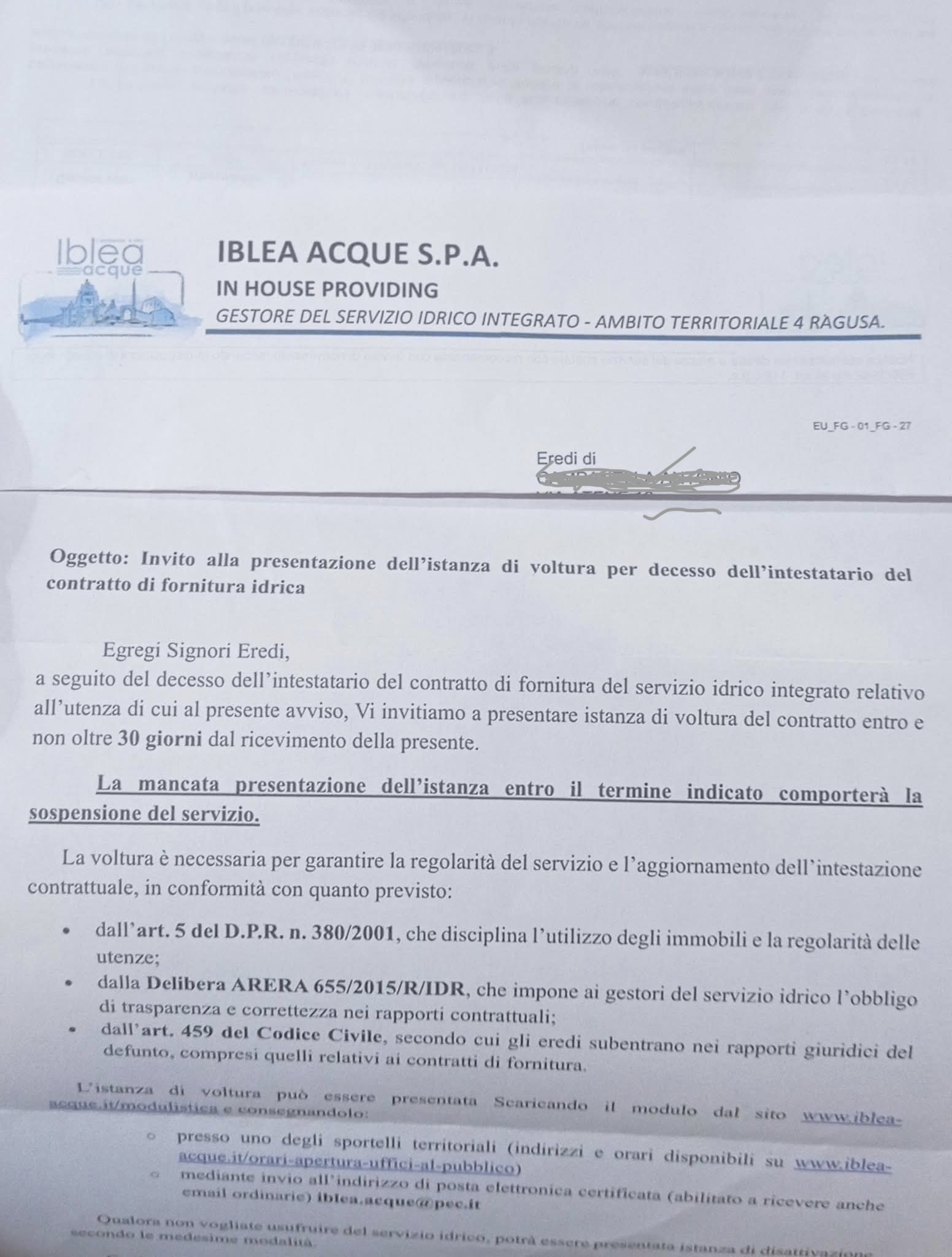 Pozzallo, 25 Marzo 2026 – Immaginate di aprire la cassetta della posta, scorrere le solite bollette e trovare una comunicazione ufficiale della società idrica indirizzata ai vostri eredi. È quanto accaduto a un pozzallese, destinatario di una lettera di Iblea Acque S.p.A. che, con estrema solerzia burocratica, lo ha dichiarato ufficialmente defunto.