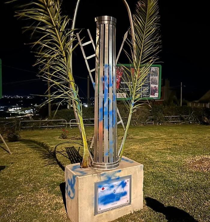 ISPICA, 29 Marzo 2026 – Un risveglio amaro per la comunità di Ispica. Nella notte, la Stele dei Cavari, monumento simbolo situato nella rotonda “Caduti di Nassiriya”, è stata oggetto di un atto vandalico: ignoti hanno imbrattato l’opera con scritte di vernice blu.
