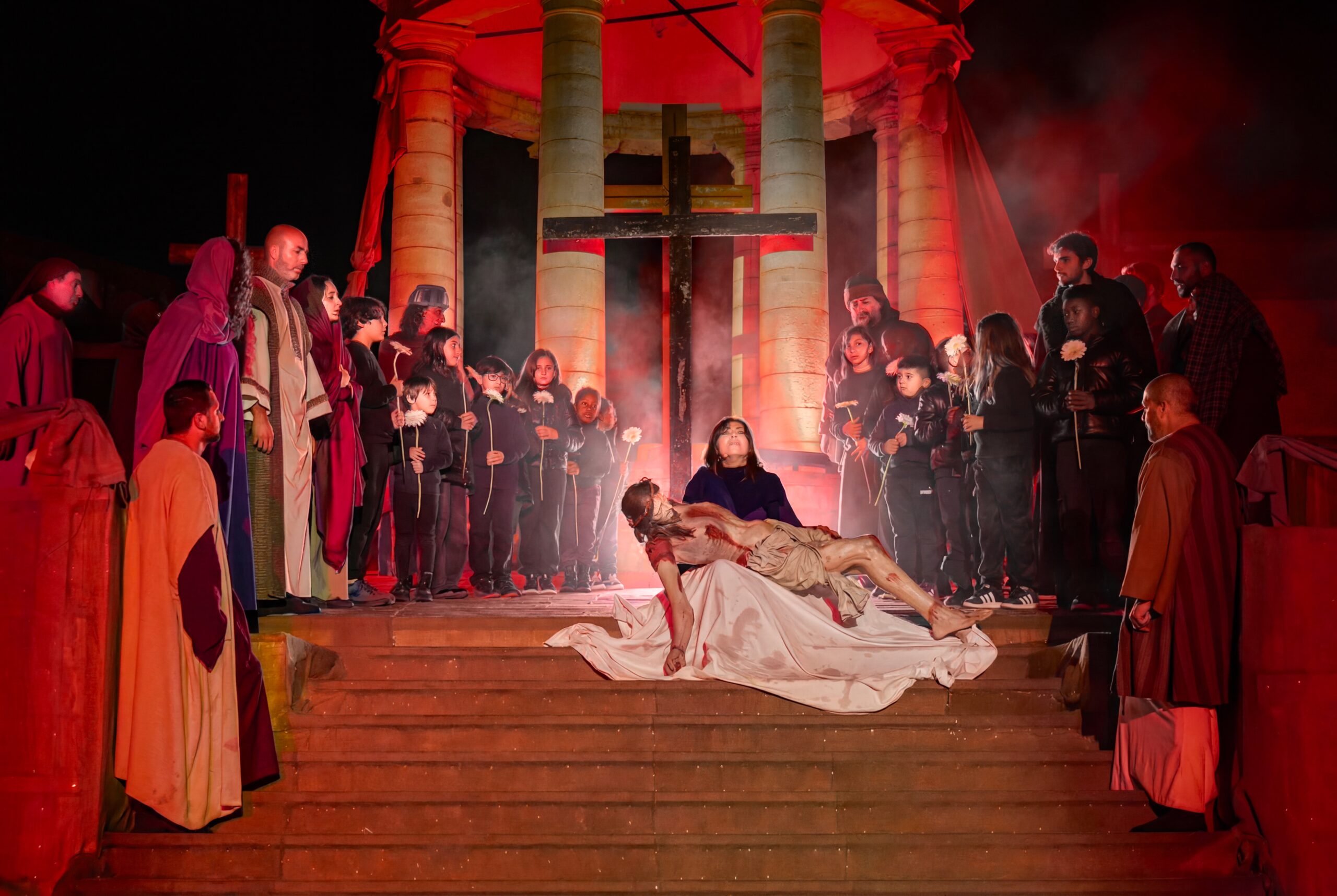 Ma è nel finale che il Dramma Sacro ha guardato negli occhi il nostro tempo: l’antica tragedia si è spogliata definitivamente della sua distanza storica con l’ingresso silenzioso di un gruppo di bambini di diversa etnia. Portando tra le mani un candido fiore bianco, si sono stretti attorno a Maria e al corpo di Cristo, componendo l’immagine di una Pietà universale e contemporanea. Un’immagine potente, simbolo inequivocabile dell’innocenza violata dalle guerre di oggi e promessa viva di quell’alba di speranza invocata dalle ultime parole della rappresentazione.