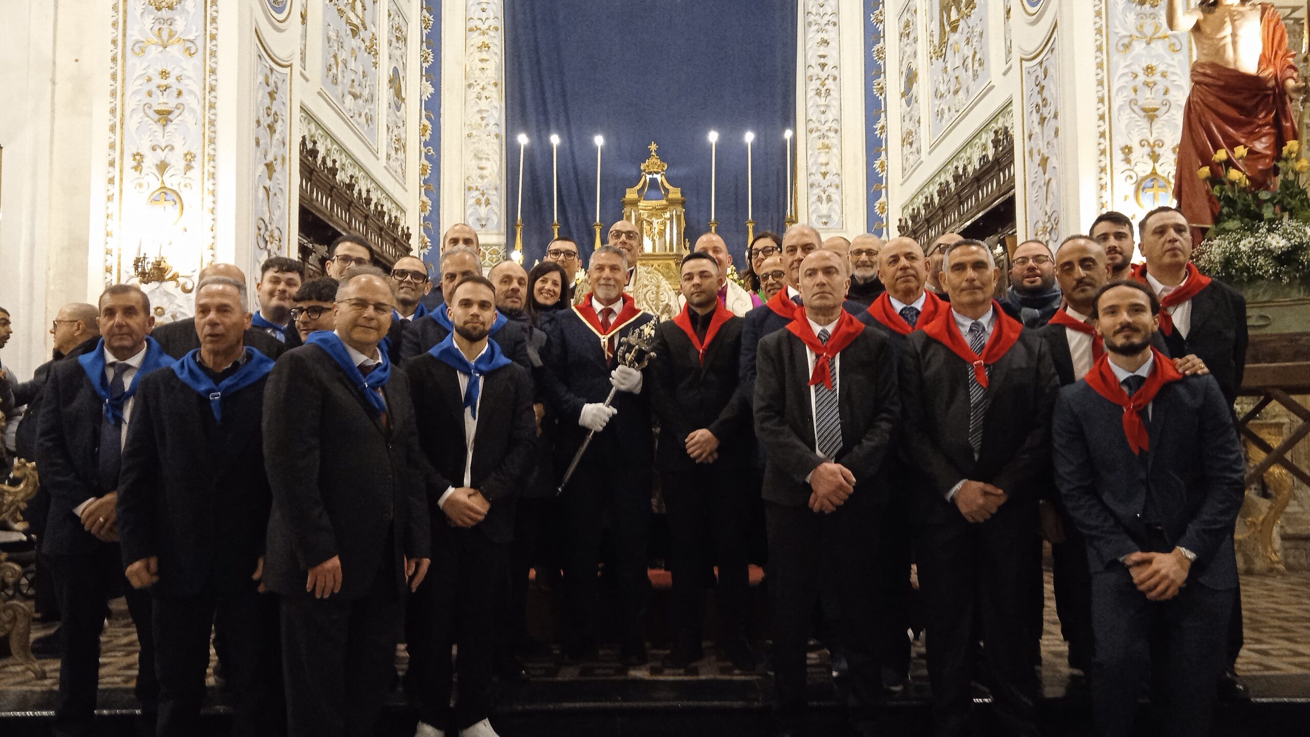 L’immagine ritrae un momento di pausa e solennità, tra le navate di una chiesa sfarzosa. Un nutrito gruppo di persone, di diverse età ma uniti dalla stessa divisa informale ma simbolica — completo scuro, camicia bianca e l’immancabile fazzoletto rosso al collo, colore del sacrificio e della festa — posa con fierezza.