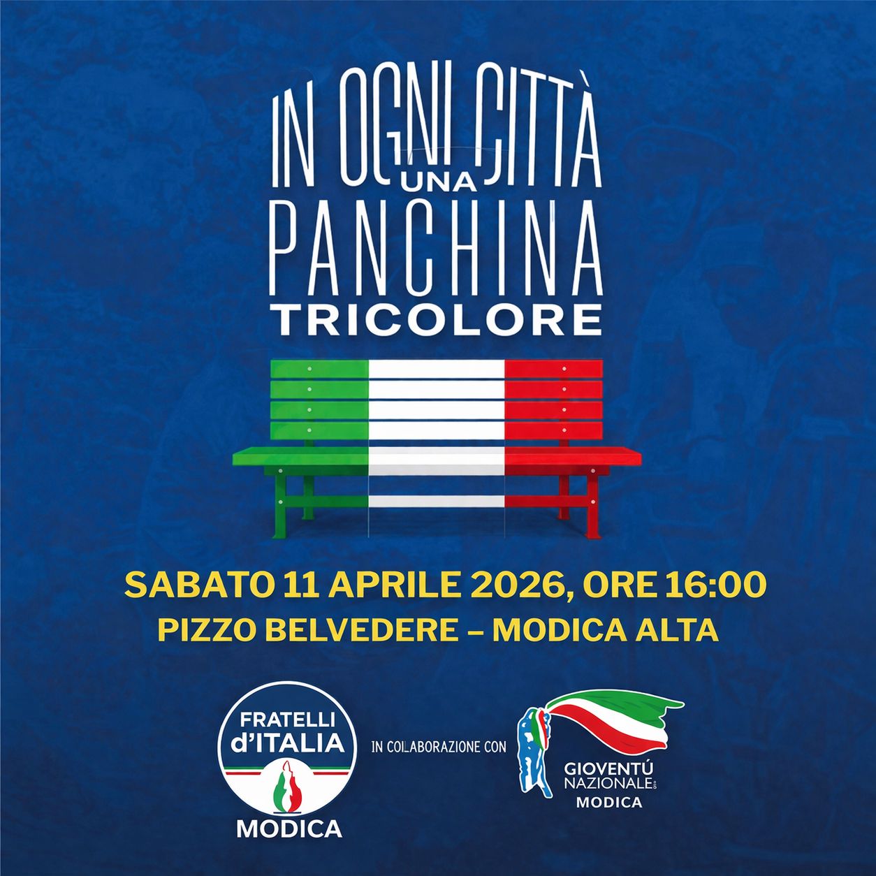 Modica, 08 aprile 2026 – Il circolo cittadino di Fratelli d’Italia di Modica, per voce del suo coordinatore Marco Nanì, esprime pieno sostegno all’iniziativa “in ogni città una panchina tricolore”, promossa dai giovani di Gioventù Nazionale. L’opera verrà inaugurata sabato 11 aprile alle ore 16:00 presso la suggestiva zona panoramica del Pizzo, un luogo simbolo della nostra città che da oggi si arricchisce di un profondo significato civile.