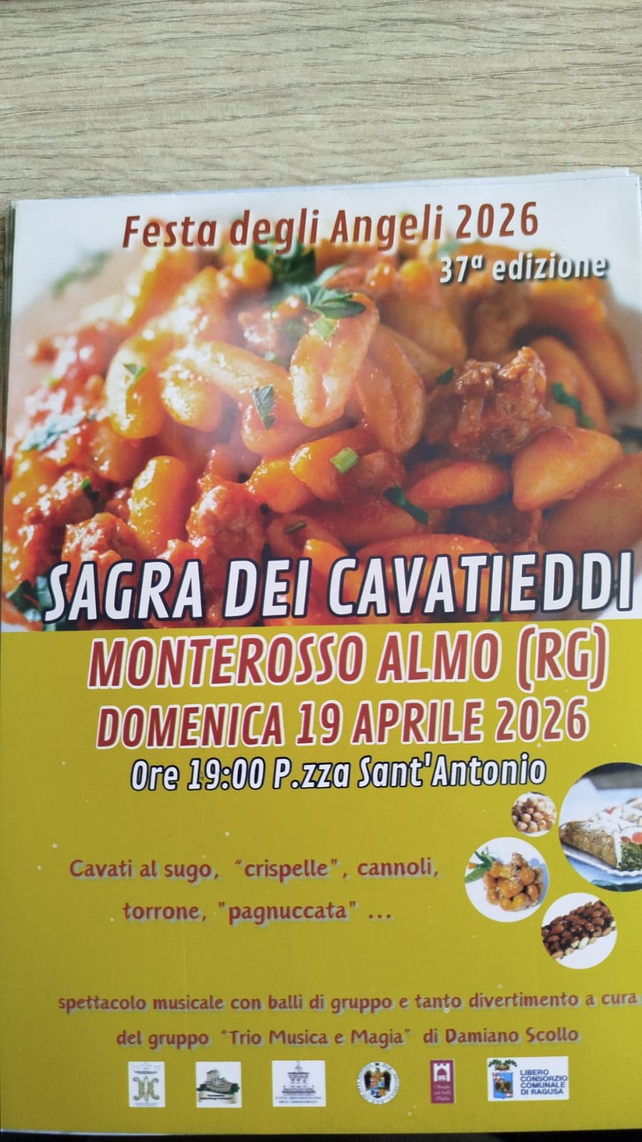 Monterosso Almo, 17 aprile 2026 – Tutto pronto nel borgo Monterosso per uno degli appuntamenti più attesi della primavera iblea. Domenica prossima, 19 aprile , torna con la sua 37ª edizione la Sagra dei Cavatieddi, inserita nel programma della Festa degli Angeli. L’appuntamento è per le 19,00 in Piazza Sant’Antonio. Protagonista assoluto sarà il “cavati”, la tipica pasta fatta a mano condita con sugo, preparata al momento secondo la tradizione monterossana. A completare il menu della sagra non mancheranno altre eccellenze dolciarie monterossane : crispelle calde, cannoli, torrone e la classica “pagnuccata”. La serata sarà animata dallo spettacolo musicale a cura del “Trio Musica e Magia” di Damiano Scollo. In programma balli di gruppo e intrattenimento per tutte le età, con l’obiettivo di trasformare la piazza in una grande festa popolare. La Sagra dei Cavatieddi, giunta alla 37ª edizione, è ormai un simbolo della tradizione gastronomica e popolare di Monterosso Almo.