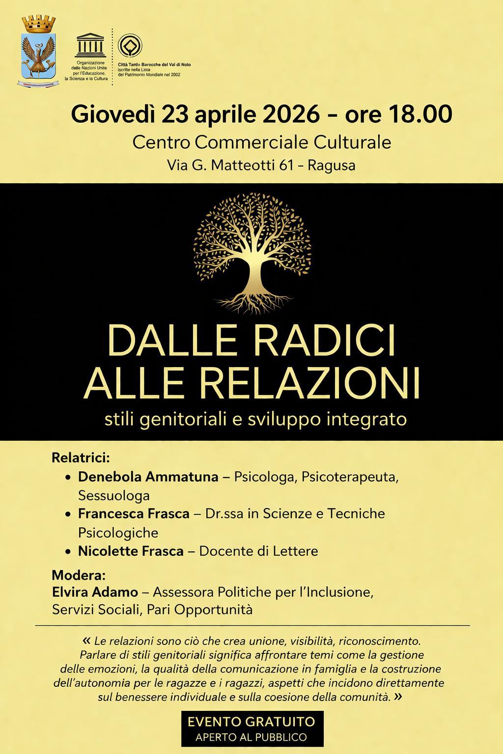 Ragusa, 18 aprile 2026 – Si terrà giovedì 23 aprile 2026 alle ore 18.00, presso il Centro Commerciale Culturale di Via G. Matteotti 61, l’incontro dal titolo “Dalle radici alle relazioni: stili genitoriali e sviluppo integrato”, un evento dedicato all’approfondimento del ruolo della genitorialità nello sviluppo psicologico, emotivo e sociale della persona.
