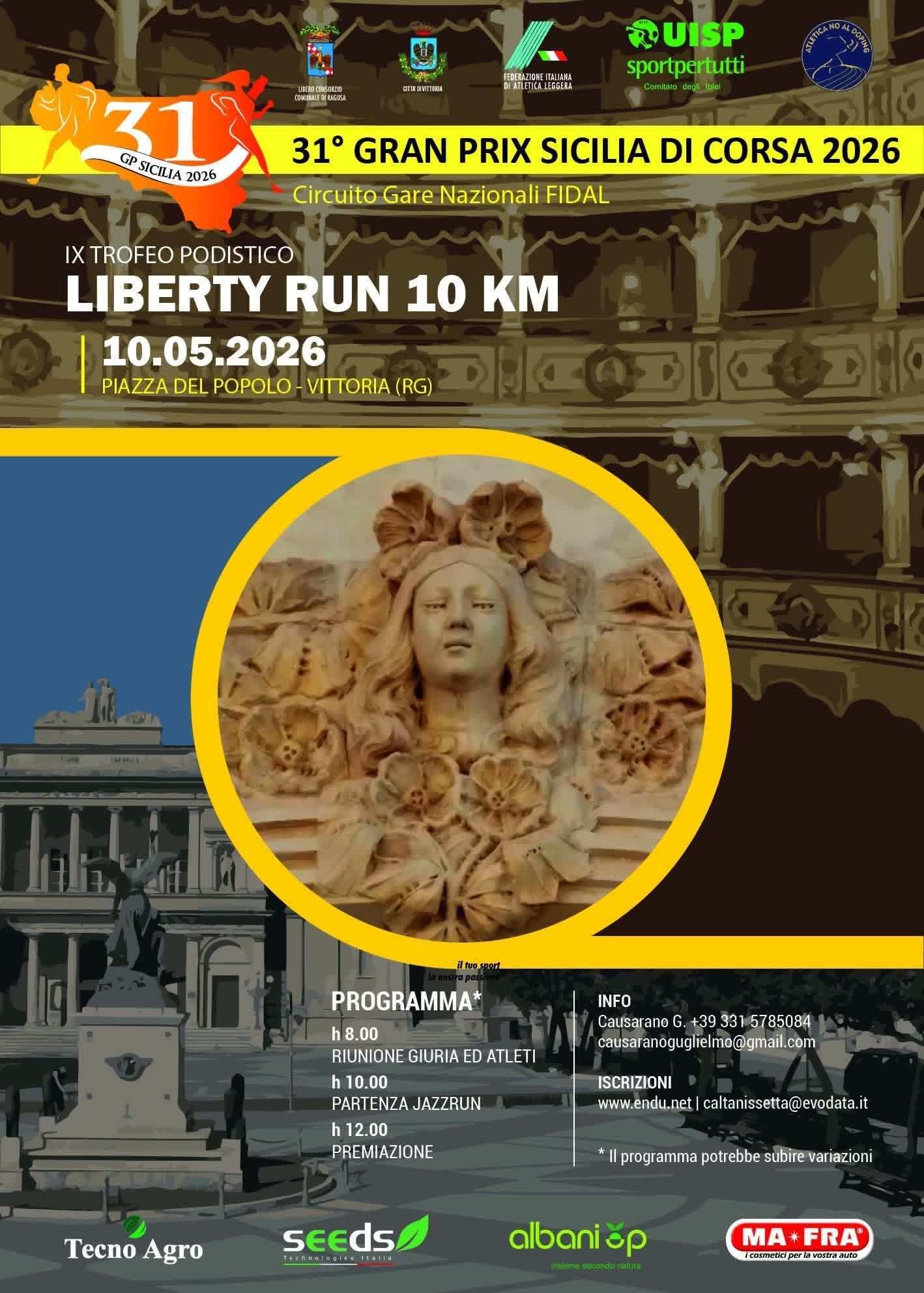 Vittoria, 21 aprile 2026 – Fervono i preparativi per la nona edizione della Liberty RUN – Città di Vittoria, in programma per il prossimo 10 maggio e che ha tutto per diventare stellare. Infatti il salotto buono di Vittoria, con la sua bellissima Piazza del Popolo, esempio del Liberty in Sicilia, vedrà i più forti atleti della Sicilia che si cimenteranno in una 10 km valida come sesta prova del 31° Campionato regionale di Corsa su strada e gara Nazionale Fidal con percosso omologato e certificato.