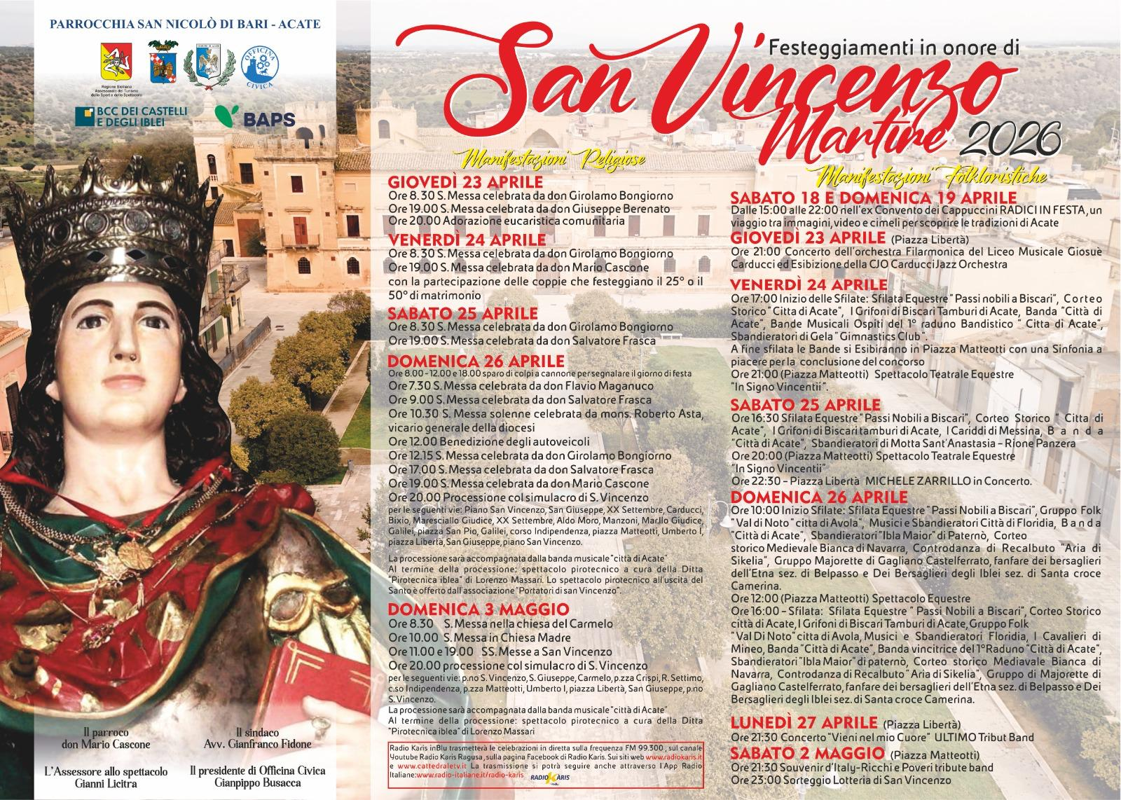 Acate, 24 aprile 2026 – In occasione dell’avvio dei solenni festeggiamenti in onore di San Vincenzo Martire, patrono di Acate, l’Onorevole Ignazio Abbate ha voluto esprimere il proprio apprezzamento per l’organizzazione di un evento che si conferma pilastro identitario e volano di crescita per l’intera comunità iblea. “La festa di San Vincenzo non è solo un momento di profonda devozione religiosa, ma rappresenta l’anima stessa di Acate,” dichiara l’On. Abbate. “Il ricco programma di quest’anno, che spazia dalle celebrazioni liturgiche alle sfilate equestri dei ‘Passi Nobili a Biscari’ fino ai grandi concerti in piazza, è il frutto di una collaborazione istituzionale solida e proficua tra la Regione Siciliana ed il Comune di Acate. Desidero ringraziare l’Amministrazione Comunale di Acate, guidata dal Sindaco Gianfranco Fidone e i consiglieri comunali per l’impegno costante nella valorizzazione del territorio. Un ringraziamento particolare va alla consigliera provinciale Irene Tidona, il cui lavoro di raccordo e la dedizione verso la propria comunità sono stati fondamentali per il raggiungimento di questi standard qualitativi.Sostenere queste iniziative significa preservare le nostre radici e il folklore locale, come dimostrano i raduni bandistici e i cortei storici previsti per il 25 e 26 aprile. Tuttavia, non dobbiamo dimenticare la rilevante ricaduta economica: eventi di tale portata richiamano migliaia di visitatori e turisti, offrendo una boccata d’ossigeno alle attività commerciali, alla ristorazione e a tutto l’indotto turistico locale. Investire nella cultura e nelle tradizioni religiose significa investire nel futuro economico del nostro territorio.” Il programma 2026 dei festeggiamenti, curato dalla Parrocchia San Nicolò di Bari e sostenuto dall’Assessorato al Turismo per tramite dell’Onorevole Abbate, culminerà con la solenne processione domenicale e i grandi eventi musicali, tra cui l’attesissimo concerto di Michele Zarrillo oltre ai tributi ai grandi della musica italiana. “L’appuntamento di Acate è un esempio virtuoso di come la sinergia tra Regione Siciliana, enti locali e associazioni possa produrre eccellenza. Invito tutti i cittadini della provincia e i turisti a partecipare a questi giorni di festa per scoprire la bellezza e l’ospitalità di questa straordinaria terra,” conclude l’On. Abbate.